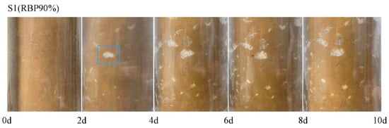 The temperature of the top plate of each group of specimens varied cyclically within ±20 °C during the freeze–thaw cycle, and the data recorded by the temperature sensors at the top and bottom of the specimens were observed to vary regularly within the predetermined range (as shown in Figure 6). It was found that the soil–rock mixture specimens showed more obvious and different degrees of freezing and thawing changes in each group during the freeze–thaw cycle. In the S1 group specimens with a higher rock content, as the number of freeze–thawing cycles increases, it can be observed that the blocks become closer to the inner wall of the transparent container. That is, the specimens are subject to significant radial displacement by freeze–swelling during the freeze–thawing cycle.