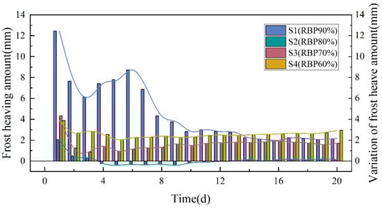 According to the change of frost heave of each group of samples, the soil rock mixture samples have different degrees of frost heave during the freeze–thaw cycles (as shown in Figure 7). With the increase in the freeze–thaw cycles, the frost heave of the sample gradually decreases and tends to be stable. However, with the increase of the content of block rock in the sample, the number of freeze–thaw cycles required for the frost heave of the sample to reach a stable state also increases correspondingly. With the increase of the rock content, the frost heave of the sample first decreases at 60–80% and increases at 80–90%. The S2 group sample with the rock content of 80% at the extreme value even has the phenomenon of frost shrinkage.