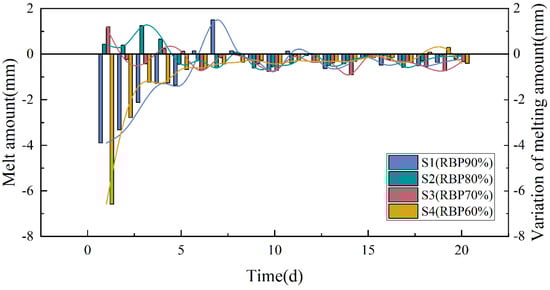 The soil–rock mixture specimens will alternately produce freezing expansion and thawing settlement during the freeze–thaw cycle, and the superposition of the two is the residual deformation of the specimens. The residual deformation of each group of specimens is shown in the Figure 8.