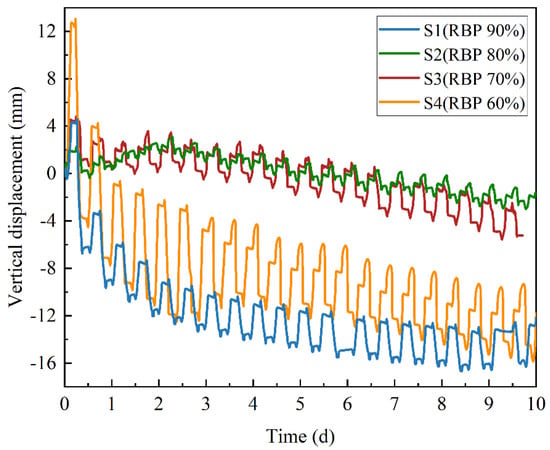 The final residual deformation produced by each specimen is shown in Table 2. When the rock content of the soil–rock mixture specimen is 60~80%, the residual deformation is all settlement deformation. With the increase of the lumpy rock content in the specimens, the settlement amount gradually decreased and reached the minimum settlement amount of 2.54 mm in the specimens of group S2 with 80% rock content, which was only 48.29% and 25.81% of the settlement amount in the specimens of groups S3 and S4, while the specimens of group S1 produced the maximum settlement amount, which was almost six times of the settlement amount in group S2.