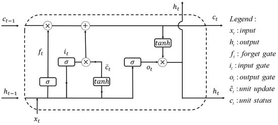 Each LSTM unit updates six parameters (see the legend of the Figure 10) in each time step. The LSTM unit extracts the mapping between input sequence and output sequence , and the update of the LSTM unit can be represented by the following formula: