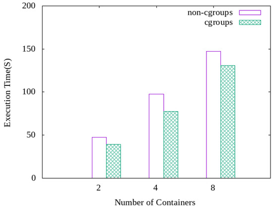 Performance of cgroups-based resource management for different numbers of containers.