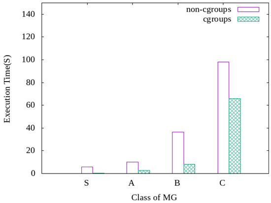 As shown in Figure 3, we observed that the performance improvement rate through cgroups was constant even when the number of containers running the MG workload increased. As a result, we confirmed that cgroups-based resource management can achieve consistent performance improvement regardless of the number of containers. The next experiment was conducted to determine the performance improvement rate through cgroups-based resource management for various IO workload sizes in the same workload type. In the experiment, several classes with different sizes of the MG workload were constructed, and the execution time of cgroups-applied cases and nonapplied cases was compared.