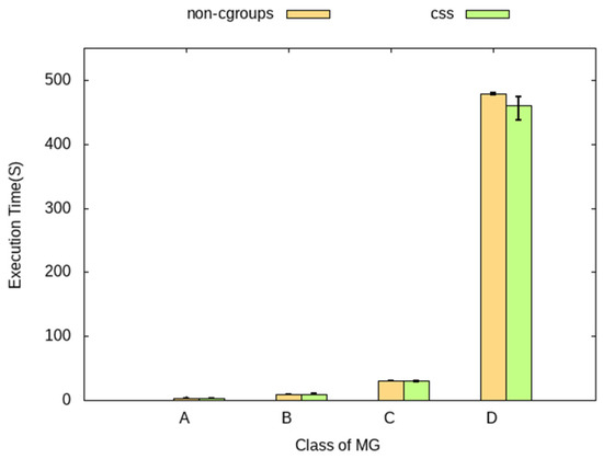 We now consider the first experiment to analyze the performance of CSS for various sizes of workloads. Among the NPB benchmark workloads, the MG workload with the highest ratio of IO operations was run, and the execution time was measured. In the experiment, the non-cgroups environment to which cgroups were not applied and cgroups environment in which CSS was internally executed were compared as baseline. The MG workload was subdivided into several classes based on size. Among all classes, A, B, C, and D were executed, and the execution time was compared. In order to generate some resource contention, two containers processing the MG workload were run simultaneously. Figure 6 shows the results of these experiments.