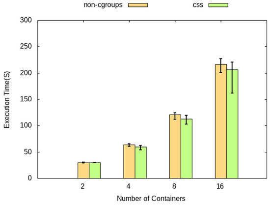 The experiment was carried out in an environment where the number of concurrently executed containers was 2 or 3, and, accordingly, CSS showed lower performance than the non-cgroups environment. As shown in Figure 8, we observed that the types of tasks of containers running at the same time did not affect the performance of containers.