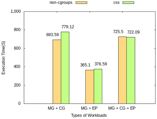 In the third experiment, the performance of CSS was measured in a situation in which workloads with various types of work were executed simultaneously. Three different environments were built for comparison; the environments in which the MG workload of the NPB benchmark was run together with CG and EP, respectively, and the environment in which CG and EP were run simultaneously. Each task was executed in an independent container environment, and the workload size was C class.