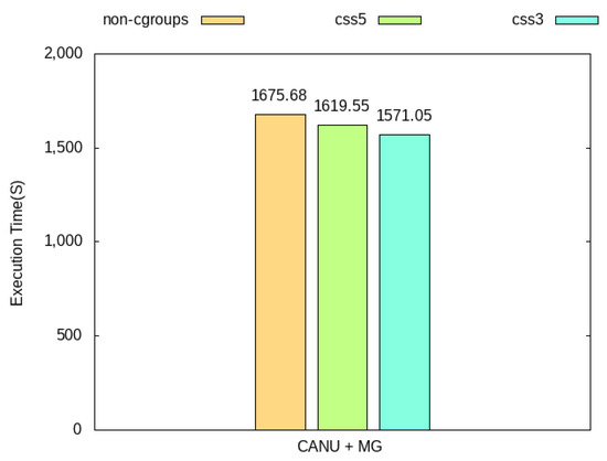 An experiment was conducted to determine whether CSS was effective in the scientific workflow type application used in the actual research field. In the experiment, an open-source framework designed for the purpose of assembling high-noise single-molecule arrays called CANU was used. The experiment was conducted based on P6-C4 molecule data published by Pacific Biosciences for Escherichia coli K12 Interpretation [16]. In order to reproduce the container environment with a high resource contention level, the MG C-class workload was executed together in a minute unit during CANU execution. In the experiment, the execution time was measured by configuring a non-cgroups environment in which cgroups were not set as a baseline, and the resource management interval options were set to 5 or 3. Figure 9 shows the form of a scientific workflow job running on the CANU framework. In the figure, the circle means the process being created, and the label inside the circle means the number of futex system calls occurring in the process. t means the time in seconds since CANU was executed.