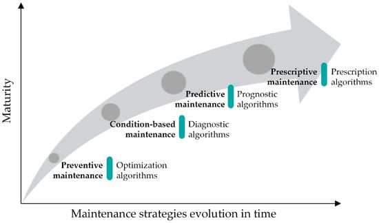 Gartner describes the path towards more advanced maintenance strategies, from preventive to prescriptive maintenance, reaching a higher level of maturity at each step [2,3]. As shown in Figure 1 starting with the basics of maintenance operations, tactics based on the knowledge and experience of maintenance managers are planned, enabling preventive maintenance. Eventually, with the help of different optimization algorithms, the logistics for better on-time use of resources can be improved. However, this strategy is not efficient as it leads to over-maintenance to guarantee service requirements.