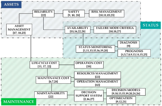 Both RQ1 and RQ2 are oriented towards prescriptive maintenance. The search performed contained these two terms: “prescriptive” and “maintenance”. Therefore, it can be stated that all the domains extracted from the selected documents can be found in the prescriptive maintenance strategy. The identified 18 domains have been classified into three defined areas: asset-oriented domains, asset status-oriented domains and maintenance-oriented domains. Figure 3 shows all the domains identified, and relevant references are also provided in each domain to those articles where more emphasis has been placed on the domain.