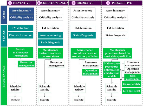 In summary, the deployment of preventive maintenance requires the definition of failure modes (FM), inspection reports, a well-defined and time-based plan of activities and a list of resources necessary to carry them out. For condition-based maintenance, the difference from the previous strategy is the addition of asset monitoring and fault diagnosis. In this way, maintenance activities are carried out based on the actual condition of assets. Predictive maintenance is based on obtaining a prognosis of the asset’s condition. This way, maintenance activities can be scheduled accordingly, with the support of operational information. Finally, it would only remain to optimize the maintenance procedure and add decision models based on the information available to automate the execution of maintenance. Once the risk analysis, service unavailability and life cycle cost have been formalized, the automation process is more reliable.