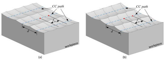Surface topography of the workpiece varies with tool orientation. (a) The tilt angle at any CC point is 0°. (b) The tilt angle at any CC point is 30°.