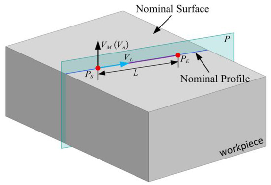 The profile method is major for evaluating surface topography, and it is widely used in machining. A 2D profile is obtained by intersecting a specified plane with the surface. The plane is determined by the 2D profile measurement line , which is a straight line that connects the start point and end point , and the normal vector of the nominal surface at the start point . Usually, and are not parallel or perpendicular. The normal vector of the plane is a unit vector. Thus, can be expressed in the form below: