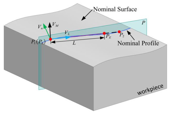 However, for a free-form surface, these points and vectors are different from those on a plane. First of all, points and are taken on the nominal surface to determine the 2D profile measurement line . The 2D profile measurement line satisfies: