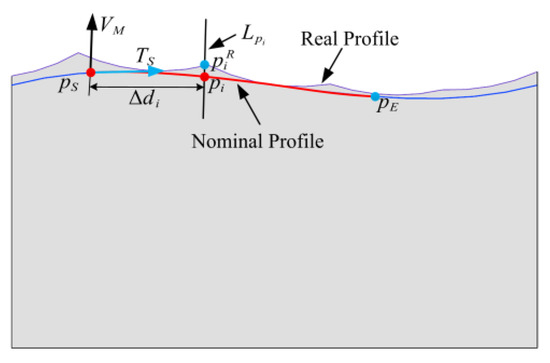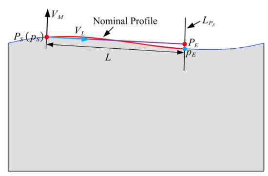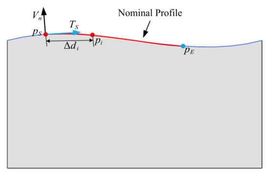 where and are the differences of the parameters between and . Figure 8 shows that within the nominal profile, the interval between any point and the starting point of the nominal contour is . When is infinitely small, the point can be considered to be on the tangent vector , so it satisfies the following equation: