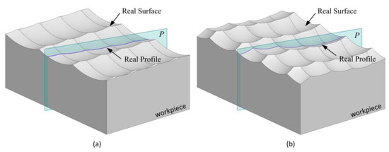 The real profile refers to the line of intersection between the real surface and the plane , which is presented in Figure 9. We found that the simulation model can be considered a series of scallops, each defined by the CC point, the principal direction, and the principal curvature.