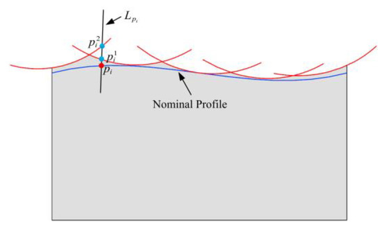 In a free-form surface as an example, line passes through point , and it is parallel to the measuring direction . Figure 10 shows that the intersection of line and the real profile is point , which corresponds to the nominal point .