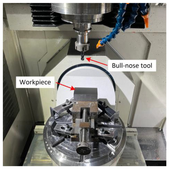 The tool used in the machining experiment was a four-tooth bull-nose cutter with a radius of and a corner radius of . Figure 13 shows the configuration of the machining experiment. The experiment blank was 82 mm long, 42 mm wide, and 62 mm high. Table 1 shows the cutting parameters for the machining experiments. Table 2 indicates that the blanks were machined using different tool orientations. The machining plane is shown in Figure 14.