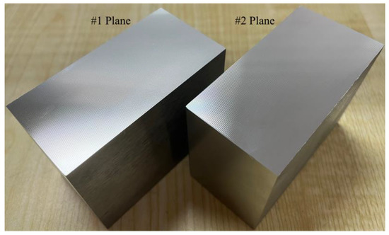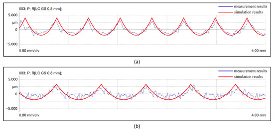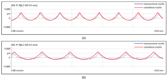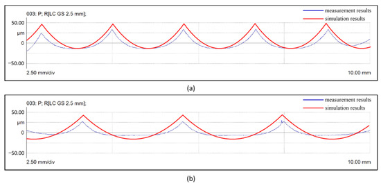 After machining, the 2D profile of the workpiece was measured by a Mahr XT20. To verify the accuracy of the model, the 2D profile was measured in two different directions and compared with the simulation results. The point was used as the starting point of the 2D profile measurement line, and the endpoints were and . The measurement and simulation results of the Planes #1 and #2 are shown in Figure 15 and Figure 16, respectively. In Figure 15 and Figure 16, the blue line represents the measurement result of the plane surface along the direction, and the red line is the simulation result. The measurement and simulation results of Plane #1 are shown in Figure 15. The results measured in Direction #1 are plotted in Figure 15a, the Rz values of measurement and simulation results are 4.3 μ and 4.5 μm, respectively. The results measured in Direction #2 are plotted in Figure 15b; the Rz values of measurement and simulation results are 3.7 μm and 4.4 μm, respectively. The measurement and simulation results of Plane #2 are shown in Figure 16. The results measured in Direction #1 are plotted in Figure 16a; the Rz values of measurement and simulation results are 5.4 μm and 6.0 μm, respectively. The results measured in Direction #2 are plotted in Figure 16b; the Rz values of measurement and simulation results are 4.8 μm and 5.3 μm, respectively. The measurement profiles are compared with the simulation results in different directions. We found that the simulation results are consistent with the measurement experiments. Accordingly, we inferred that the proposed 2D profile can be effectively applied to simulate the plane surface.