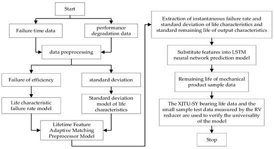 To address the above problems, this paper proposes a small-sample adaptive residual life prediction model for mechanical products based on feature matching preprocessor-LSTM. First, to address the low accuracy of residual life prediction for small samples of mechanical products caused by multiple time scales and multiple fault states, this paper fuses failure time data and performance degradation data and introduces failure rate and standard deviation of life characteristics as the residual life. In this paper, the failure time data and the performance degradation data are fused, and the failure rate and the standard deviation of life characteristics are introduced as the residual life prediction criteria to reflect the failure of a component or system at a certain time. To meet the current demand of adaptive residual life prediction data with small samples, this paper adopts the statistical matching method and establishes the adaptive matching preprocessor model of life characteristics.