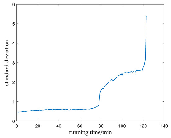 When the sample data has the characteristics of small samples, the trend of the standard deviation of life characteristics curve can be seen and the standard deviation of life characteristics in the life of incidental failure period with the growth of life is relatively flat in the wear and tear period, with the growth of life changing sharply [25,26]. According to the life characteristic standard deviation curve, the small-sample life characteristic standard deviation model is constructed as: