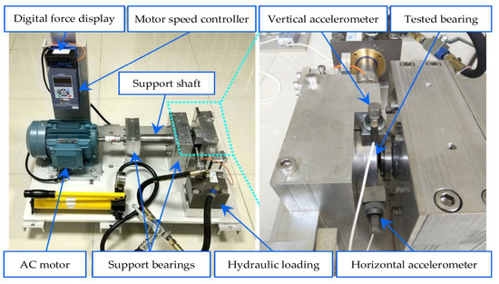 In order to verify the validity of the proposed model, the bearing life dataset from Xi’an Jiaotong University [31] was used as the research object, and its dataset acquisition process is shown in Figure 4. Two acceleration sensors were used for testing the vibration data in horizontal and vertical directions, respectively. The sampling parameters were set as shown in Table 1, and a total of 123 sets of experimental data were obtained.