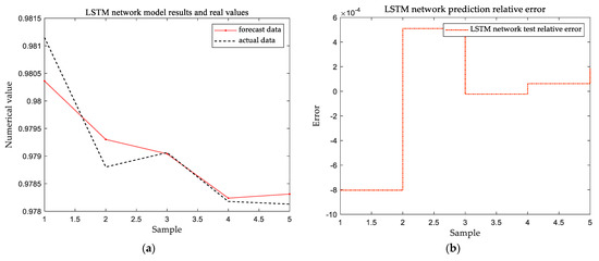 When 13 to 22 groups of experiments were selected, the results of the comparison between the predicted and real values, the relative error values of prediction, and the training process are shown in Figure 5a,b. LSTM network prediction absolute mean error MAE = 2.7668 × 10−4, LSTM network prediction mean absolute error percentage MAPE = 2.8233 × 10−4, LSTM network prediction root mean square error RMSE = 3.8662 × 10−4.