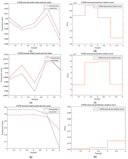 When 113 to 122 sets of experiments were selected, the LSTM network prediction results are shown in Figure 5g,h, with absolute mean error MAE = 0.0110, LSTM network prediction mean absolute error percentage MAPE = 0.0203, and LSTM network prediction root mean square error RMSE = 0.0140.