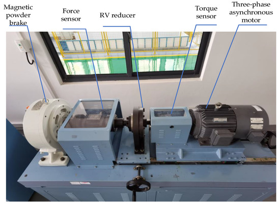 The power of the servo motor used in the experiment is 5 kw, the range of the torque sensor is 15 N·m, the range of the torque sensor is 200 N·m, and the specification of the magnetic powder brake is 1.5 kw. The speed of the spindle is set to 151 r/min, the input and output shafts of the RV reducer are measured by the torque sensor, and the model of the RV reducer is RV-20E. The data are sampled every 0.5 s. The experiment was conducted at room temperature, and the model parameters of the main equipment of the experimental platform are shown in Table 2.