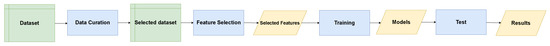 From the original dataset, a curation process is performed, which also defines the initial dataset to be used. After that, the FS process is applied, and the selected features will be used to train the ML algorithm. The best classification ML model will be chosen after analyzing the results, their accuracy, and the number of false negatives.