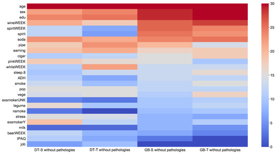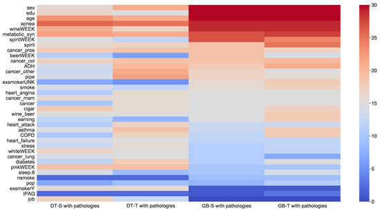 Two datasets were generated using the variables of Appendix A.1. One of them, called dataset with pathologies, includes the variables related to pathologies. This dataset includes most of the features. In particular, all the variables, excluding variables 37 to 40. The objective of this dataset is to evaluate the classifiers with standard data of the pools, which includes information on the health record of the person.