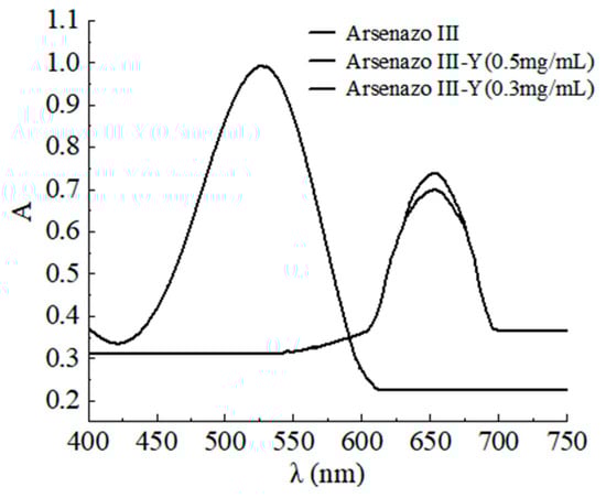It can be seen that the complex formed by arsenazo-III and the rare-earth metal has a characteristic absorption peak at 653 nm. There is an absorption peak at 520 nm for the arsenazo-III without the rare-earth metal, while the absorption peak of arsenazo-III shifted from 525 nm to 653 nm after adding the rare-earth elements. Then, the absorption peaks at 653 nm increased with the increase in the rare-earth content. Therefore, the absorbance was measured at the wavelength of 653 nm.