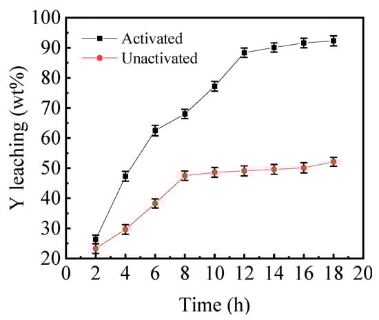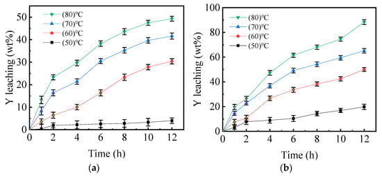 The effect of the reaction time on the leaching efficiency was explored further, and the results are given in Figure 7. The samples were tested at a variety of reaction temperatures, before and after mechanical activation. When comparing a with b, it was discovered that the metal yttrium in the inactivated sample can hardly be leached out at the reaction temperature of 50 °C, whereas the metal yttrium in the mechanically activated sample was leached in a small amount, and the leaching efficiency tends to be stable as the reaction time increases. When the leaching time was 12 h and the reaction temperature was 80 °C, the leaching efficiency of the mechanically activated samples reached 88.37%, but the leaching efficiency of the inactivated samples was only 48.61%. It was determined that mechanical activation can greatly improve the leaching efficiency of yttrium at higher temperatures, whereas mechanical activation has a minimal influence on the leaching efficiency of metallic yttrium at lower temperatures.