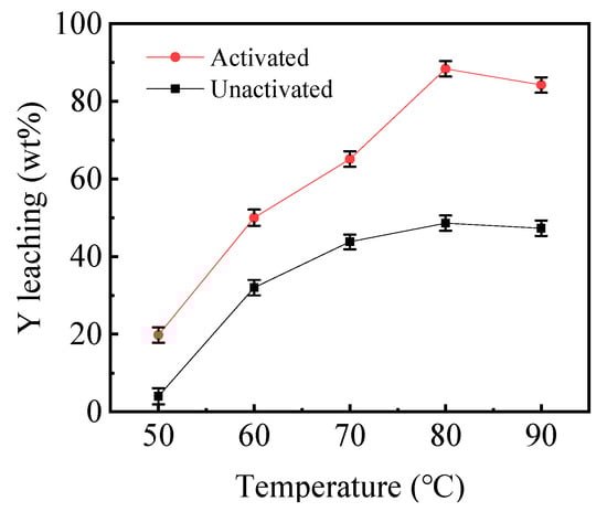 To explore the influence of temperature, rare-earth carbonate was leached at various temperatures, ranging from 50 to 80 °C under the condition of the mechanical activation time of 60 min, and the leaching time (tL) of 12 h; the findings are displayed in Figure 6. Figure 6 shows that the leaching efficiency of yttrium increases from 20.5 to 88.2% when the activated samples are heated from 50 to 80 °C. Similarly, the leaching efficiency of the yttrium increased from 4.5 to 46.5% for the inactivated samples. This indicated that a moderately high temperature is required. When the temperature exceeds 80 °C, the leaching efficiency of the yttrium remains nearly unchanged at 12 h. Consequently, 80 °C was chosen as the optimal leaching temperature for the following experiments. With increasing reaction temperatures, the available energy for the activation of atoms and molecules correspondingly increases. Furthermore, as the temperature increased, the mass transfer coefficient and rate of chemical reaction enhanced [].