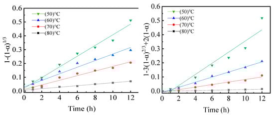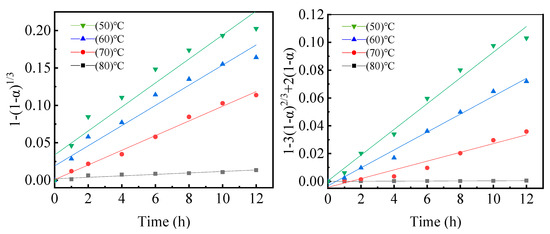 Using the same analysis method as described above, the plots of 1 − (1 − α)1/3 and 1 − 3(1 − α)2/3 + 2(1 − α) versus leaching time, respectively, were tested and are presented in Figure 10. As demonstrated in Figure 10, the linear equation showed good fits with the experimental results. For the plots of 1 − (1 − α)1/3 versus the leaching time, the minimum value of the adjusted coefficient of determination (adjusted (Adj.) R2) of these plots was 0.9713, while it was 0.9878 for the plots of 1 − 3(1 − α)2/3 + 2(1 − α) versus the leaching time. These findings suggested that the diffusion step was more likely to control the leaching of Ye from the activated sample.