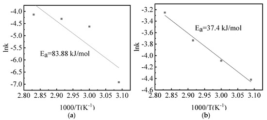 where A represents a frequency factor; Ea describes the apparent activation energy of the leaching reaction; R represents a gas constant; and T represents the leaching temperature. The logarithm of the kinetic rate constant (lnk) versus 1/T had a good linear relationship (Figure 9a). The apparent activation energy was determined to be 83.88 kJ∙mol−1 based on the slope. These findings indicated that the chemical reaction controls the leaching process.