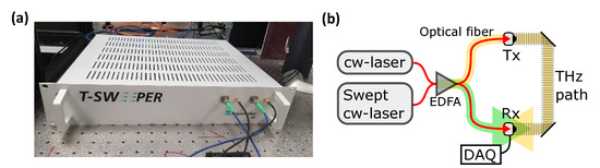 T-Sweeper. (a) Photograph of the instrument. (b) Schematic drawing of instrument operation, components, and the optical and THz beam paths. Extracted from [22]. Tx—transmitter; Rx—receiver; DAQ—data acquisition.