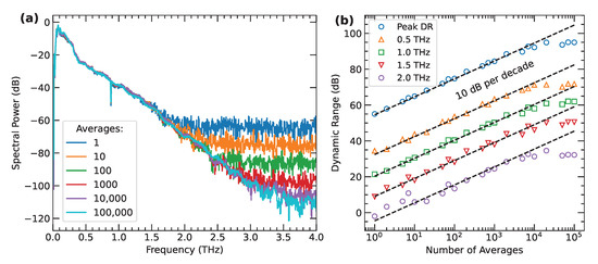 Dynamic range is defined as the ratio or maximum measurable signal () and the noise floor (NF): [24]. Dynamic range is important because it represents the range of signal amplitude values that can be measured by the system. As a consequence, it limits the maximum material loss that can be accurately quantified [25]. For TDS and FDS systems, DR is frequency-dependent, because it is proportional to . DR can be increased by averaging, since it is inversely proportional to NF. For random (Gaussian) noise, averaging lowers the noise floor by a factor of , where N is the number of traces [26]. Due to the spectral profile of the instrument, reducing the noise floor extends the frequency range.