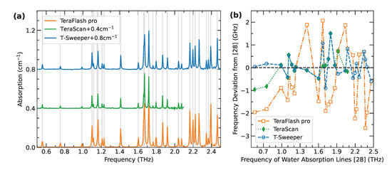 Due to the broadband frequency range of the optoelectronic FDS-System, a frequency calibration standard must have multiple narrow spectral features. A common approach is to employ gas absorption lines, whose frequencies are known with high precision [29]. Atmospheric water vapour provides a convenient set of absorption lines in the 0.5–4 range that is widely used for frequency calibration of THz spectrometers. Figure 3a depicts the transmission spectrum through the ambient atmosphere showing water vapour absorption lines, measured by the three devices. Figure 3b plots the deviations of the measured lines from the frequencies listed by HITRAN [29], with results obtained by TeraFlash and TeraScan for comparison. For all three instruments, the deviations are randomly distributed and lie within the uncertainty of their frequency resolution, confirming the accuracy of their frequency scales. It is observed that T-Sweeper demonstrates the smallest deviations from the HITRAN data, due to its high frequency resolution ( 1 ) and low noise. TeraFlash has the largest deviations due to its lowest frequency resolution ( 5 ).