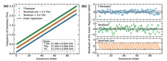 (a) Frequency of the peak maxima plotted versus peak order, with the linear fit for all three devices. For clarity, values of the TeraScan and TeraFlash pro have been offset. The slopes of linear regression are shown in the bottom right inset. Since this is the distance between the successive minima and maxima, this must be doubled for the calculation of FSR (cf. above). (b) Frequency residuals of extreme values, measured with T-Sweeper, TeraFlash and TeraScan. The dashed lines represent half the frequency resolution.