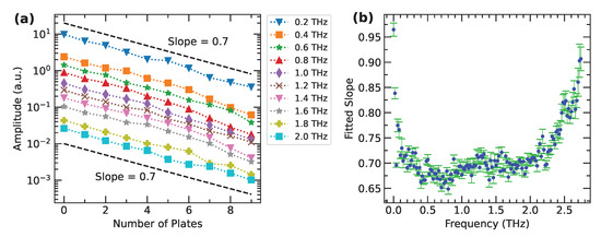 (a) Measured transmitted amplitude as a function of the number of Si plates, for different frequencies. Dashed lines show the expected slope. (b) The fitted slopes for all frequencies up to . For clarity, only every 20th datapoint is shown.