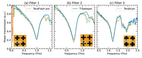 Resonant mesh filters offer good test materials because they have well-defined spectral features. Such filters typically consist of a thin wafer or film of THz-transparent polymer with deposited or embedded metal pattern of crosses on a square grid. The grid size (g), the size of the crosses (a), and widths of the lines (b) determine the central frequency of the filter and its bandwidth [35]. The filters used in this work were manufactured by Novalia Ltd by printing a 40 thick aluminium structure on a 23 thick polyester (PET) substrate. Figure 6 shows the transmission of three of these filters, which were measured with all three instruments.