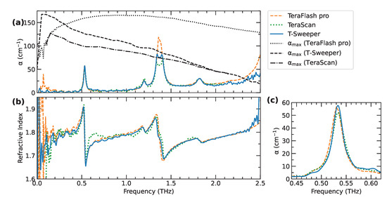Also plotted (dashed lines) in Figure 7a are the values of maximum measurable absorption for the DR of each instrument [25], showing the limits of measurement. The strong resonance at can only be fully captured by TeraFlash, as the other two devices have insufficient dynamic range. Figure 7b shows good agreement in the measured refractive index, except around where TeraScan data deviated significantly. The peak in Figure 7c has been examined more closely with the T-Sweeper , TeraFlash and TeraScan . Figure 7c shows that the spectrum measured by TeraFlash is very similar to that of the T-Sweeper. In contrast to the other two devices, slightly lower absorption is measured by TeraScan, but overall, good agreement is observed among three instruments, in particular between T-Sweeper and TeraFlash.