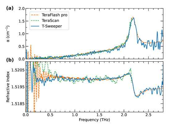 Figure 8a shows that the frequency range of TeraScan is insufficient to record the entire absorption peak, with only the low-frequency part being detected. The peak maximum was measured at by TeraFlash and by T-Sweeper. The peak profile measured by the T-Sweeper is skewed at the peak maximum, explaining the difference in the measured peak frequencies. The skewed profile is caused by the noise and the filtering of the signal. Considering the FWHM of the peak, as determined using the Python library SciPy, these are for the TeraFlash pro and for the T-Sweeper. Figure 8b shows good agreement in the measurements of the refractive index, except at frequencies below where the TeraScan deviates significantly. Overall, the measured values of UHMWPE are in good agreement for all three instruments.