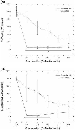 Bacterial growth inhibition in the presence of L. philippiana essential oil and mineral oil. The effect of different volume/volume ratio of essential oil (solid line) and mineral oil (segmented line) was evaluated using (A) S. aureus and (B) K. pneumoniae. Results were averaged from 3 independent experiments (n = 3). Statistically significant differences (p < 0.05) compared essential oil and mineral oil treatments are indicated with an asterisk (*).