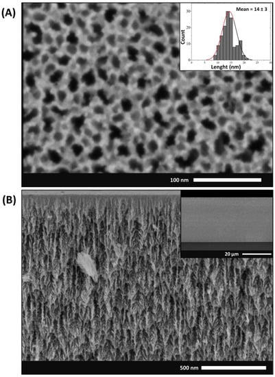 Field emission scanning electron microscopy (FE-SEM) was used to study the morphology of the nPSi structure. Figure 2A,B shows surface and cross-section images of a representative nPSi layer, respectively. The nPSi surface was characterized by a homogeneous pore distribution with a mean pore diameter of 14 ± 3 nm (Figure 2A). Moreover, as seen in Figure 2B, the thickness of the nPSi layer was 30 µm in depth, with a longitudinal column-like pore structure. On the other hand, the gravimetric analysis presented an average porosity of 75 ± 5% for this type of nPSi structure.