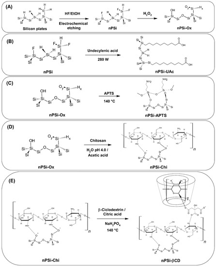 Nanostructured porous silicon (nPSi) synthesis and functionalization process. (A) nPSi synthesis and oxidation reaction (nPSi-Ox); (B) nPSi/Undecylenic acid reaction (nPSi-UAc); (C) nPSi-Ox/APTS reaction (nPSi-APTS); (D) nPSi-Ox Chitosan reaction (nPSi-Chi) and (E) nPSi-ox/βCD reaction (nPSi-βCD).