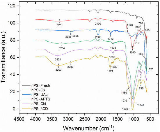 To monitor the success of each process, FTIR measurements were carried out (Figure 4). The nPSi-Ox reaction was chemically induced by H2O2. The FTIR spectrum shows a characteristic strong absorption band at 1040 cm−1 and a stretching mode shoulder at 1170 cm−1, which are related to asymmetric stretching in Si-O from the Si-O-Si group, confirming the success of the process [22]. Additionally, weak absorbance bands appeared at 615 cm−1 and 790 cm−1 related to the Si-H and Si-OH bonds, respectively. Furthermore, a weak O–H stretching band from Si-OH groups appears at 3261 cm−1 and the surface signal assigned to Oy-Si-Hx stretching mode can be observed at 885 cm−1 and 2100 cm−1 [22,23].