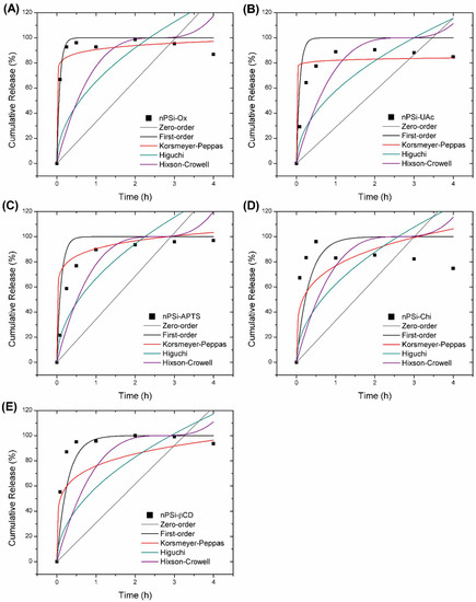 Figure 5 shows the experimental release profiles of the essential oil obtained for each functionalization. The models were evaluated up to 4 h, the moment at which a constant cumulative release of essential oil into the solution was observed. In that sense, the controlled release reached a maximum at time of 0.5 h for nPSi-Chi (Figure 5D), 2 h for the cases of nPSi-Ox, nPSi-UAc and nPSi-βCD (Figure 5A,B,E, respectively), and 4 h for nPSi-APTS (Figure 5C). Variations in the release profiles were due to the volatile chemical compounds from L. philippiana essential oil, which easily evaporated at normal temperatures.