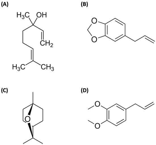 Chemical structure of the most abundant compounds in Laureliopsis philippiana essential oil: β-Linalool (A), β-Isosafrole (B), Eucalyptol (1,8-Cineole) (C) and Methyleugenol (D).