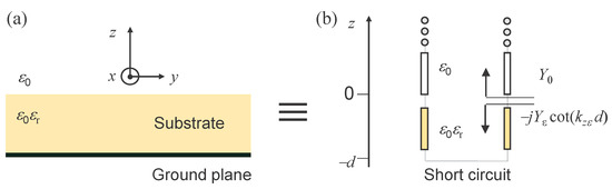 However, we were interested in an accurate material characterization of the substrates, which took into account the losses and frequency dispersion. To this aim, in analogy with the procedure carried out in [17], we developed an equivalent circuit model (see Figure 3) to derive a theoretical amplitude reflection coefficient (a time dependence of the fields was assumed) at the air–substrate interface, viz., . Thus, by definition (see, e.g., [29]) we had , where and are the characteristic admittance at and the input admittance looking downwards at , respectively. According to Figure 2b, , is the wave admittance in the air, and , and are the wave admittance and the propagating wavenumber in the dielectric substrate of thickness d. The amplitude reflection coefficient finally reads: